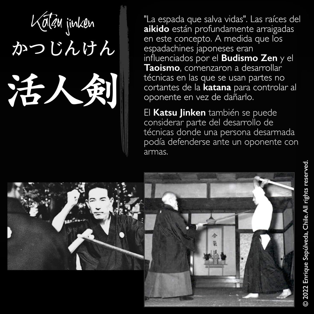 | Katsu Jinken | La espada que salva la vida. A medida que la esgrima japonesa se vio cada vez más influenciada por el budismo (especialmente el budismo zen) y el taoísmo, los practicantes se interesaron cada vez más en incorporar principios éticos en su disciplina. El maestro consumado de la espada, según algunos de estos practicantes, debería ser capaz no solo de usar la espada para matar, sino también para salvar vidas. El concepto de KATSU JIN KEN encontró alguna aplicación explícita en el desarrollo de técnicas que usarían partes no cortantes de la espada para golpear o controlar al oponente, en lugar de matarlo. La influencia de algunas de estas técnicas a veces se puede ver en el aikido. Se desarrollaron otras técnicas mediante las cuales una persona desarmada (o una persona que no quisiera sacar un arma) podía desarmar a un atacante. Estas técnicas se practican con frecuencia en el aikido. |
