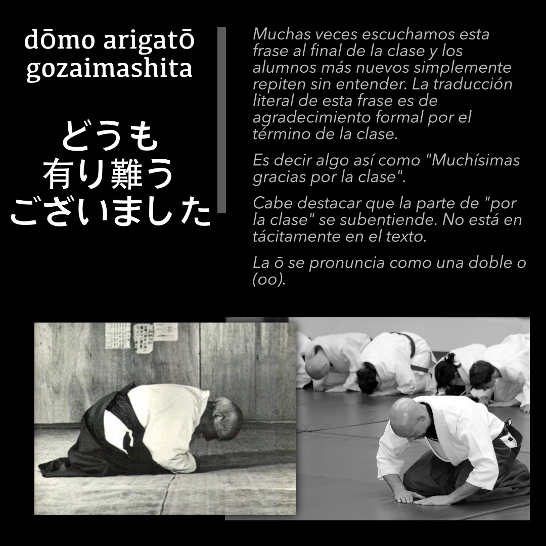 | Domo Arigato Gozai Mashita | Muchas gracias. Literalmente, ‘De alguna manera se ha superado una dificultad con honor, y lo aprecio’. Al final de cada clase, es apropiado hacer una reverencia y agradecer al instructor ya aquellos con quienes se ha entrenado. |