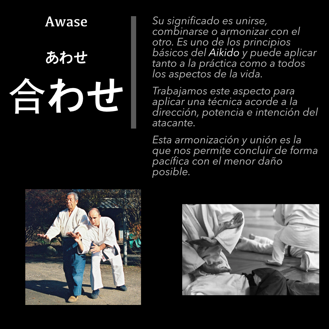 | Awase | Combinarse o moverse juntos. Por ejemplo, la práctica en pareja con armas se puede hacer “paso a paso” o awase. |