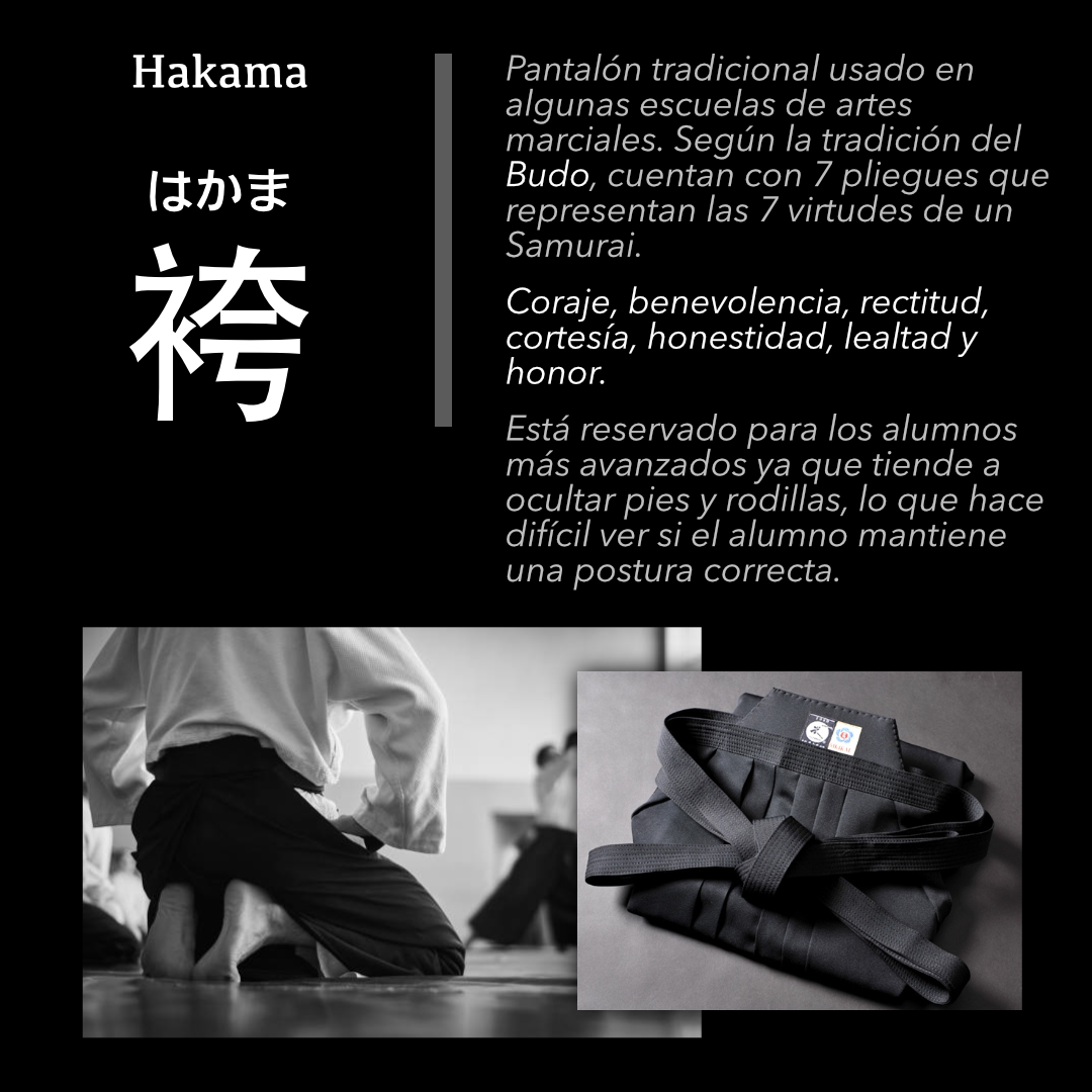 | Hakama | Una prenda exterior tradicional japonesa que se usa sobre los pantalones gi. De color negro o azul, son más formales, brindan protección al rodar y caer y ayudan a ocultar el movimiento del pie. Tradicionalmente, los usan quienes tienen el rango de shodan; algunos dojos permiten que las mujeres de cualquier rango los usen. |