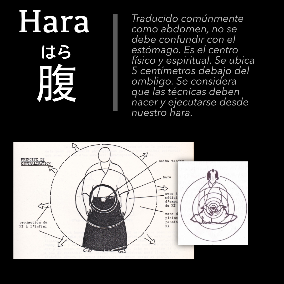 | Hara | El centro de masa de uno, ubicado aproximadamente a 2″ debajo del ombligo. Tradicionalmente, se pensaba que esta era la ubicación del espíritu/mente/(fuente de KI). Las técnicas de Aikido deben ejecutarse tanto como sea posible desde o a través del HARA de uno. |