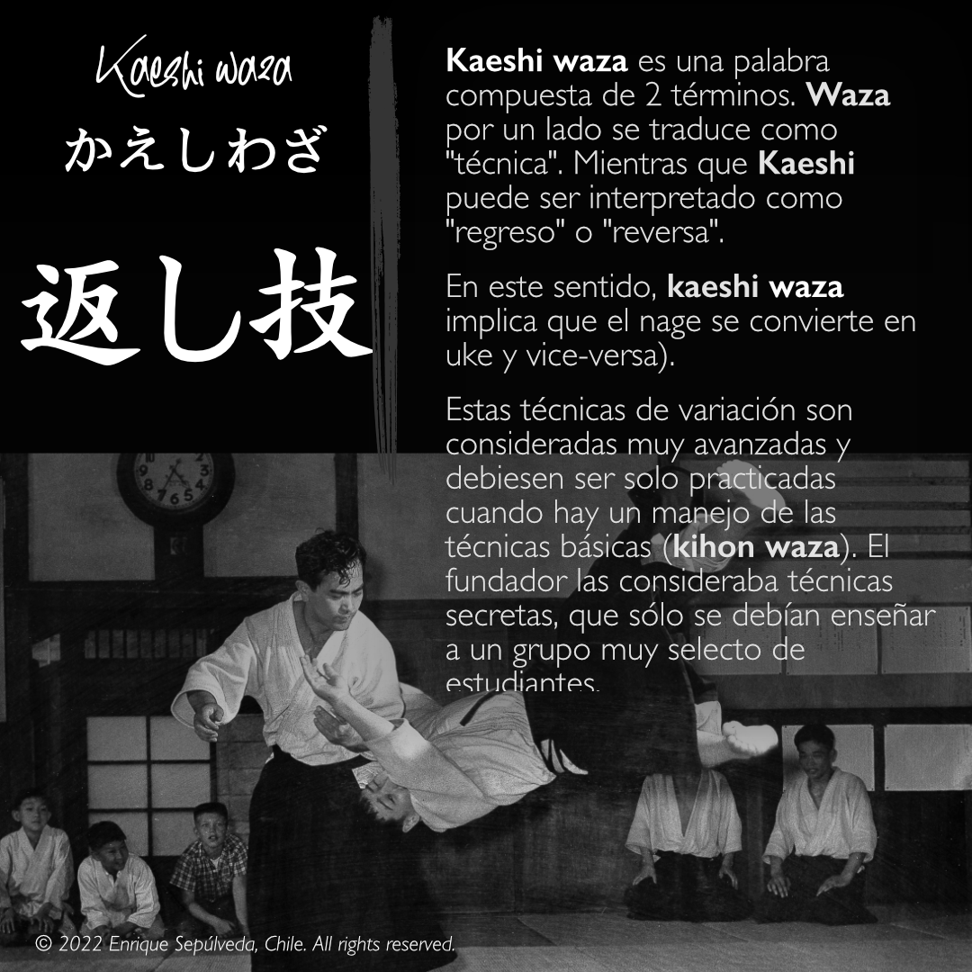 | Kaeshi waza | Inversión de la técnica. (UKE se convierte en NAGE y viceversa). Esta suele ser una forma de práctica muy avanzada. La práctica de KAESHI WAZA ayuda a inculcar una sensibilidad a los cambios de resistencia o dirección en los movimientos de la pareja. El entrenamiento para anticipar y prevenir la aplicación de KAESHI WAZA contra las propias técnicas agudiza enormemente las habilidades de aikido. |