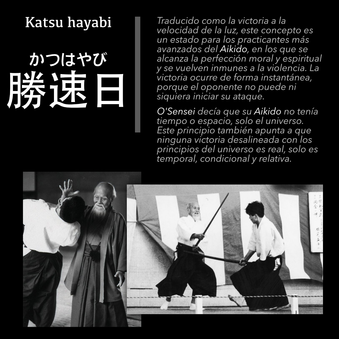 | Katsu Hayabi | Victoria a la velocidad de la luz del sol. Según el fundador, cuando uno haya alcanzado el dominio total de sí mismo (Agatsu) y el perfecto acuerdo con los principios fundamentales que gobiernan el universo (especialmente los principios que cubren la interacción ética), uno tendrá a su disposición el poder de todo el universo, ya que no habrá más. diferencia real entre uno mismo y el universo.En esta etapa de avance espiritual, la victoria es instantánea. La misma intención de un atacante de perpetrar un acto de violencia rompe la armonía con los principios fundamentales del universo, y nadie puede competir con éxito contra tales principios. Además, la expresión de los principios fundamentales del universo en la vida humana es el amor (Ai), y el amor, según el fundador, no tiene enemigos. Al no tener enemigos, uno no tiene necesidad de luchar, y así siempre sale victorioso. (ver Agatsu y Masakatsu) |