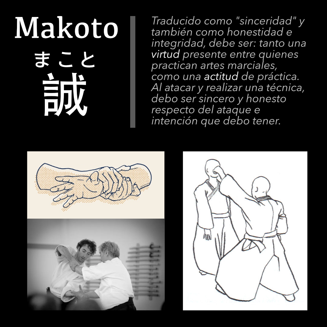 | Setsuzoku | Conexión. Las técnicas de Aikido generalmente se vuelven más eficientes al preservar una conexión entre el centro de masa de uno (HARA) y los límites exteriores del movimiento, o entre el centro de masa de uno y el de su compañero. Además, SETSUZOKU puede connotar fluidez y continuidad en la técnica. En un nivel psicológico, SETSUZOKU puede connotar la relación de acción-respuesta que existe entre uno mismo y su compañero, de modo que el desempeño exitoso de las técnicas de aikido depende crucialmente de sincronizar las propias acciones y respuestas con las de su compañero. |
