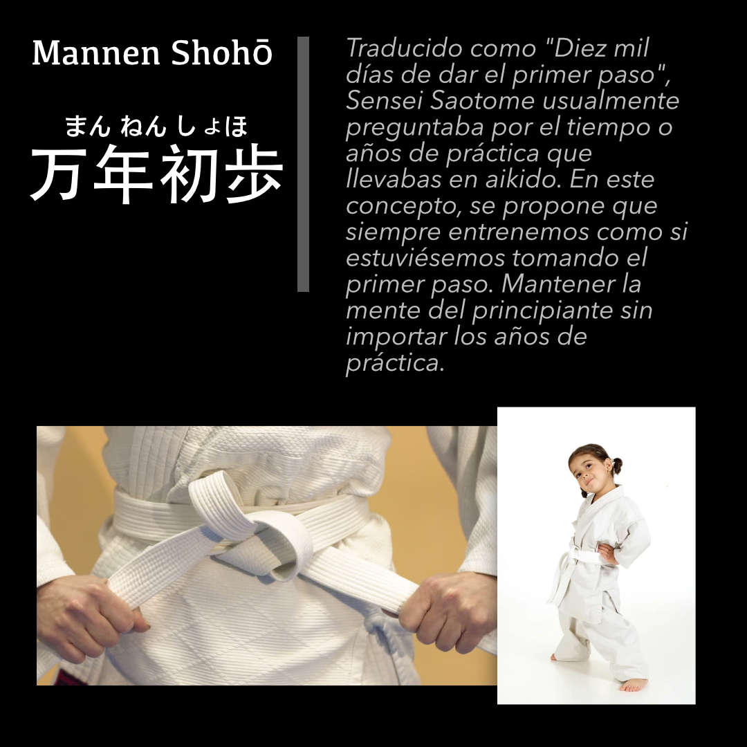 | Shugyo | Entrenamiento – espiritual, mental, físico, ascético. La lucha del día a día. Educarse para refinar y purificar la calidad de vida. O Sensei dijo: “En tu entrenamiento, no te apresures, ya que lleva un mínimo de diez años dominar los conceptos básicos y avanzar al primer peldaño. Nunca pienses en ti mismo como un maestro perfeccionado que todo lo sabe. Debes continuar. entrenar diariamente con tus amigos y alumnos y progresar juntos en el Camino de la Armonía”. |