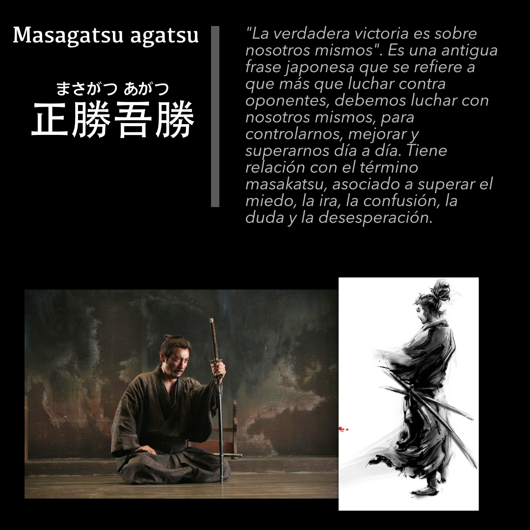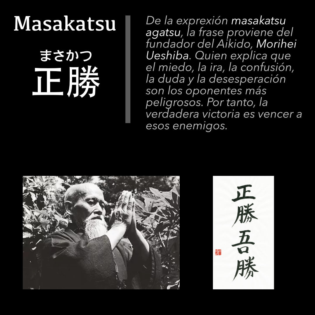 | Agatsu | Victoria propia. Según el fundador, la verdadera victoria (Masakatsu) es la victoria que uno logra sobre sí mismo (Agatsu). Así, uno de los “eslóganes” del fundador fue Masakatsu Agatsu: “La verdadera victoria del autodominio”. |