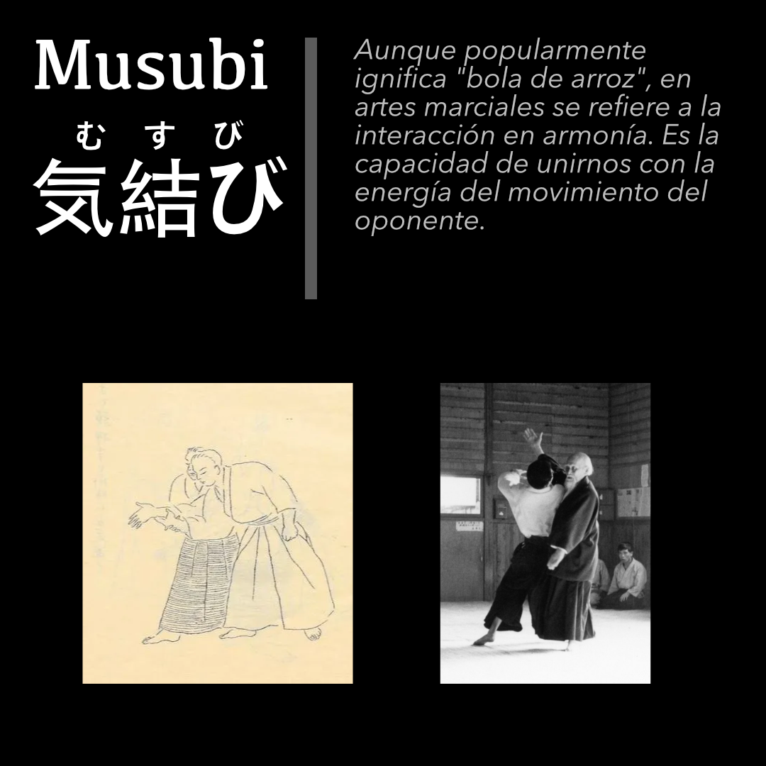| Takemusu | La “valiente fuerza procreadora de la armonía, plenamente integrada, generadora de vida, totalmente libre y capaz de transformación ilimitada”. Un “eslogan” del significado del fundador “arte marcial infinitamente generativo de aiki”. La técnica marcial que surge espontáneamente después de muchos años de entrenamiento repetitivo con una base sólida en los conceptos básicos. El alcance del aikido no se limita solo a las técnicas estándar y nombradas que uno estudia regularmente en la práctica. Más bien, estas técnicas estándar sirven como depósitos de principios más fundamentales (KIHON). Una vez que uno ha interiorizado el KIHON, es posible generar una variedad virtualmente infinita de nuevas técnicas de aikido de acuerdo con condiciones novedosas. |
