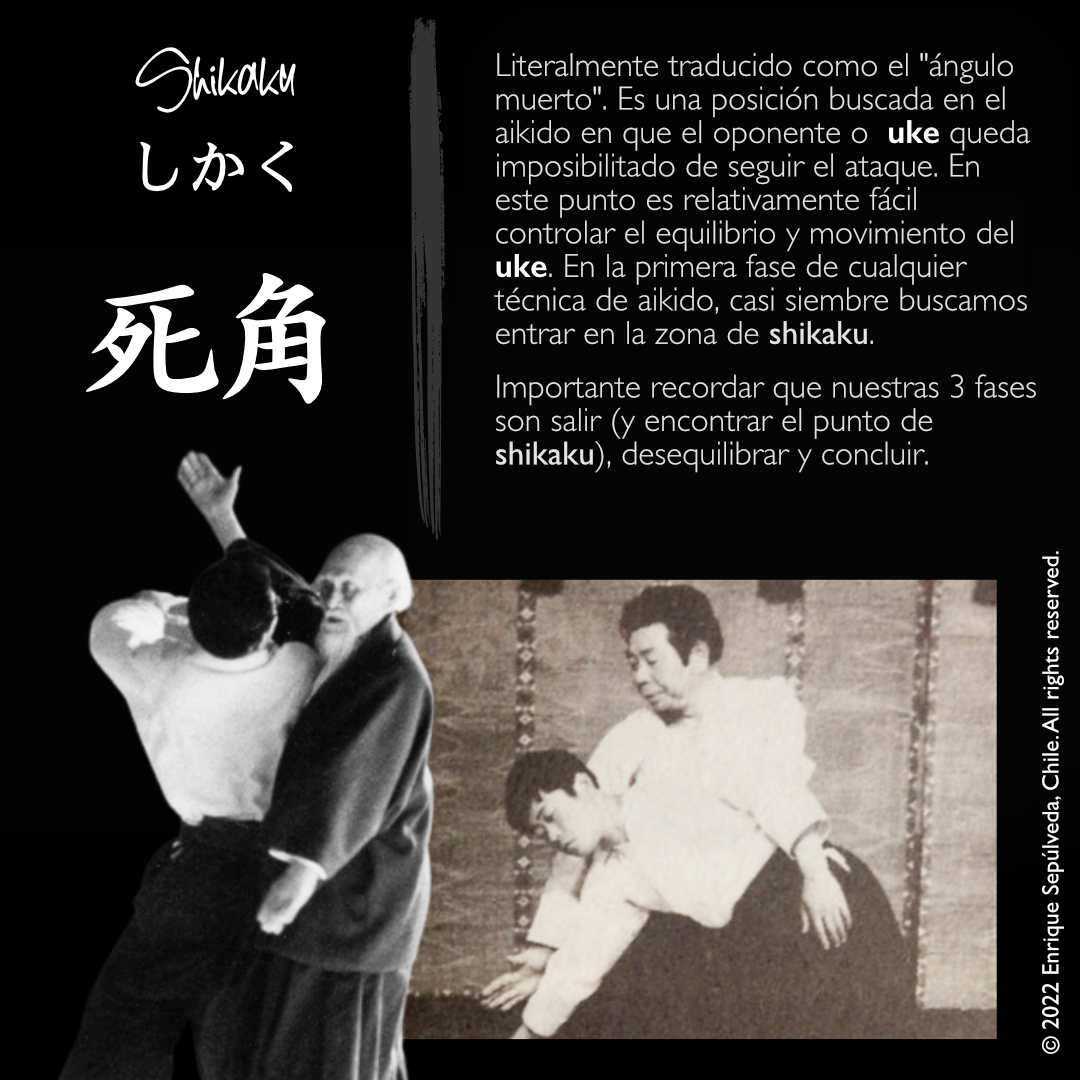 | Shikaku | Literalmente “ángulo muerto o ciego”. Una posición relativa a la pareja en la que le resulta difícil (continuar) atacar, y desde la cual es relativamente fácil controlar el equilibrio y el movimiento de la pareja. La primera fase de una técnica de aikido suele ser establecer SHIKAKU. |
