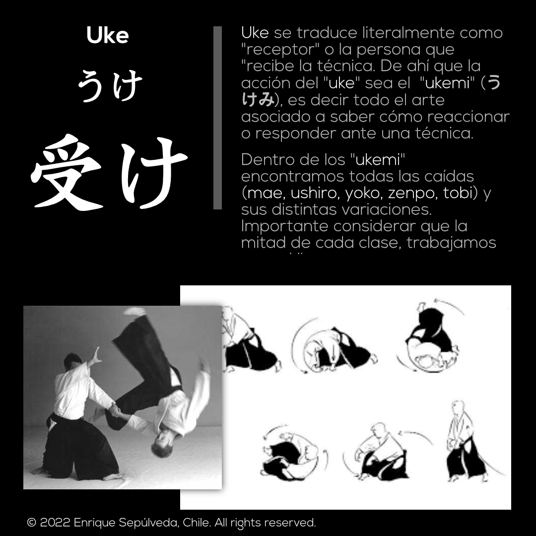 | Uke | Persona que es lanzada (recibiendo la técnica). A altos niveles de práctica, la distinción entre UKE y NAGE se vuelve borrosa. En parte, esto se debe a que no queda claro quién inicia la técnica y también porque, desde cierta perspectiva, UKE y NAGE son completamente interdependientes. |
